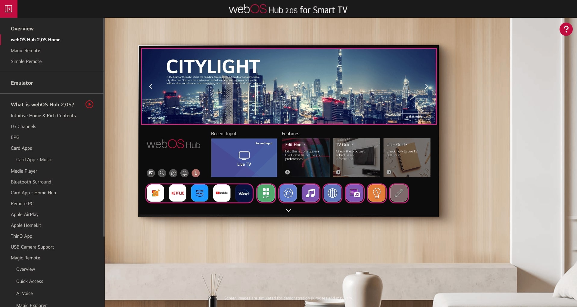 A smart TV OS simulator and emulator, including interactive step-by-step guide for different features and overview of remotes and the OS